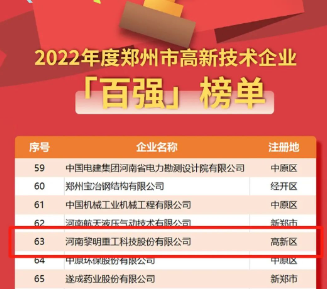 近日,黎明重工再創(chuàng)佳績(jī),鄭州市科學(xué)技術(shù)情報(bào)研究所公布了2022年度鄭州市高新技術(shù)企業(yè)“雙百”榜單,黎明重工憑借過(guò)硬的企業(yè)實(shí)力成功入選。
